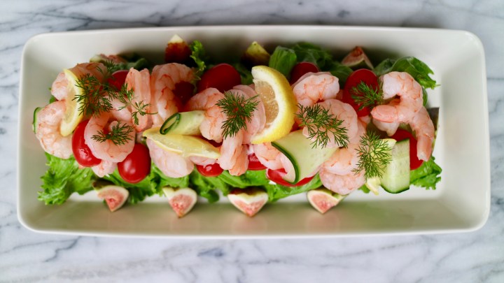 Time to decorate the sandwich cake. Start with washing the green leaves and them place them on all sides. Cut the tomatoes in half, slice the cucumber in thin slices and peel the shrimps. Cut the lemon in thin slices and then place them all on top of the cake. Finish with some fresh dill. Cut the figs in quarters and place them around the cake.