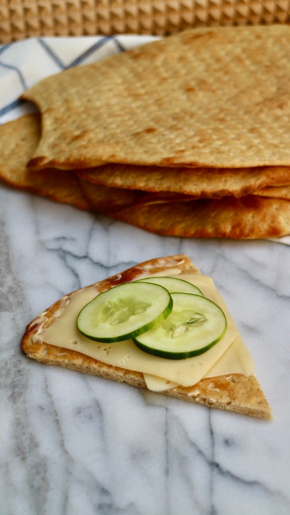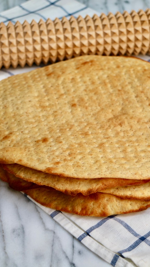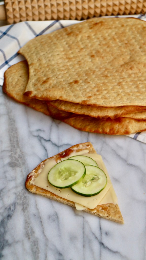 This is a very popular bread in Sweden called Hönökaka. It is like a flatbread and named after the island town Hönö in Gothenburg’s northern archipelago. The bread is baked in round flat pieces, but when you buy it in Sweden, it is normally sold as half-circles. Just as with round Swedish crisp breads, the Hönökaka is rolled with a crisp bread rolling pin which gives the characteristic picked bread. It is simple to bake and delicious!