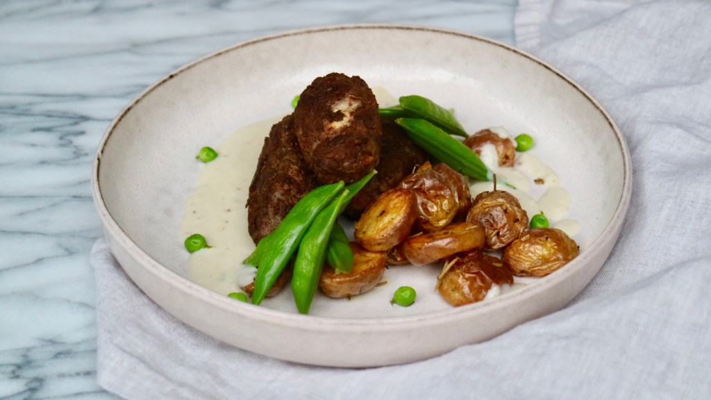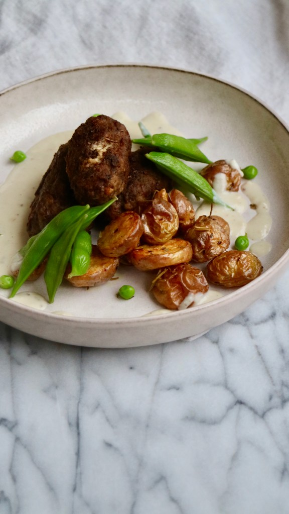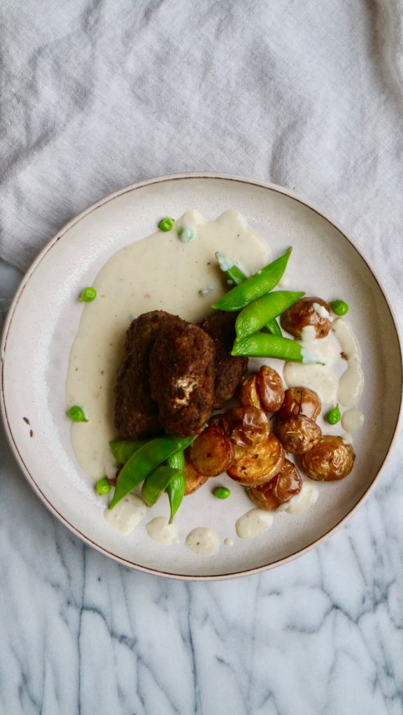 Beef croquette (or ”Järpar” in Swedish) is a common autumn dish in Scandinavia. Traditionally you use ground beef, but it’s also very common with lamb, veal or chicken. When you grow up in Sweden, I’m 100% sure you have been served Beef croquettes for lunch in school. We normally serve the croquettes with mashed potatoes, a creamy sauce and lingonberry. I have added a little bit extra to this traditional meal, I am filling the beef croquette with feta cheese and fresh parsley, serving them with grilled mini potatoes, sugar snap peas and a delicious creamy sauce to the beef croquettes.