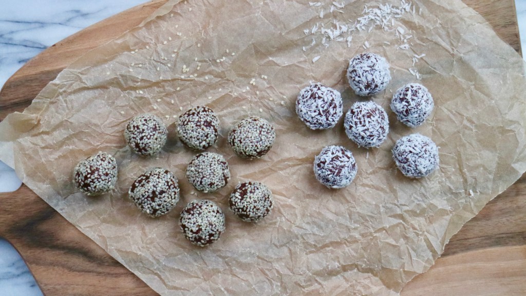 Add the dough onto a baking board. Divide the dough into approximately 15 pieces and roll into balls with wet hands. Roll each ball in coconut flakes and/or sesame seeds.